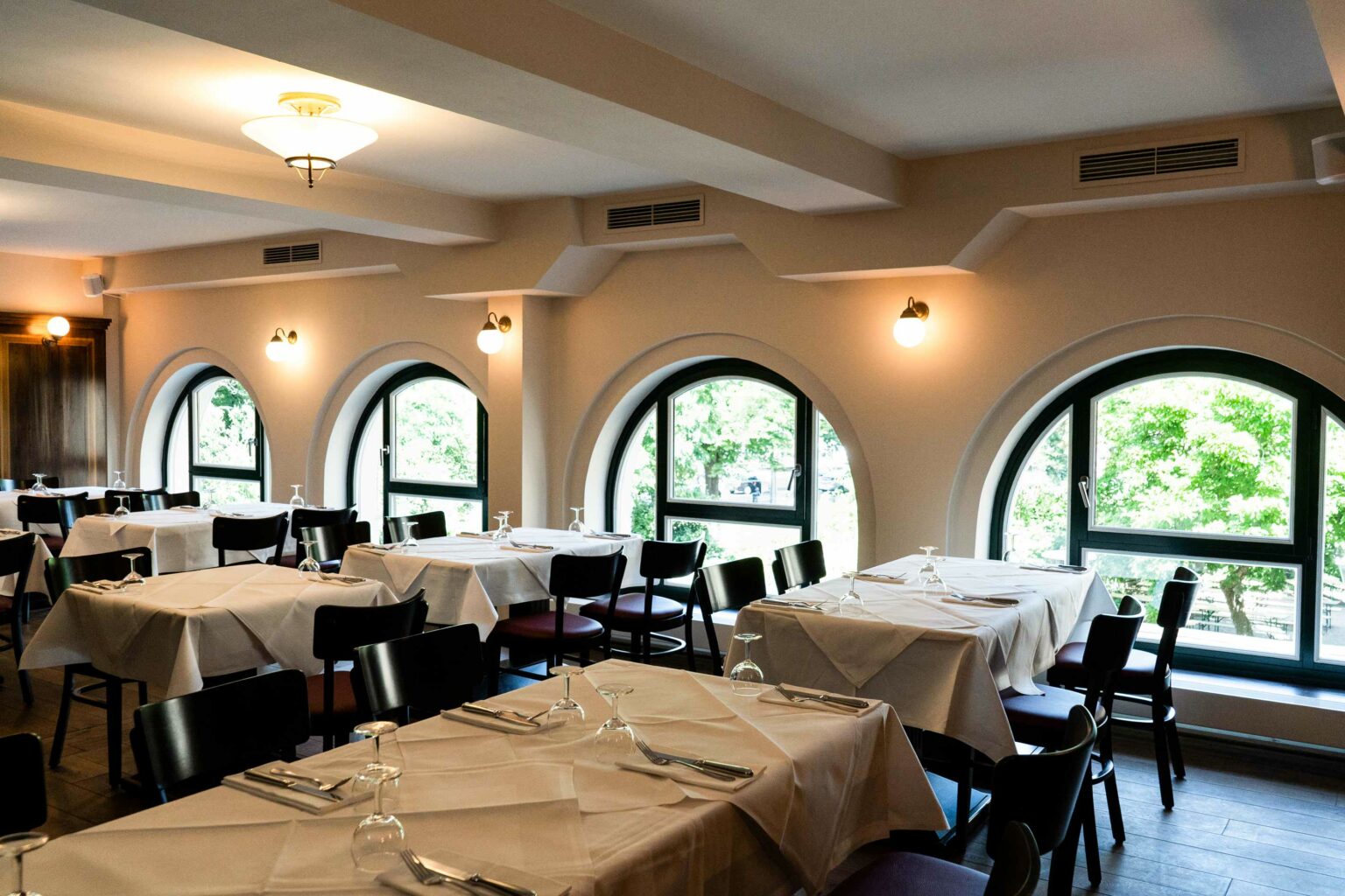 Unser Bankettsaal wird regulär mit weißen Tischtüchern und weißen Stoffservietten sowie mit Menü-Besteck, Weingläsern und Menagen eingedeckt.